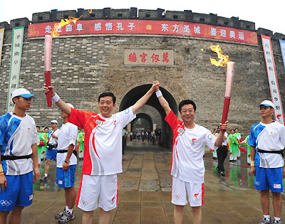 Torchbearer Zhu Anting (L), a Qufu government official, poses with Li Ting from CCTV. The Qufu leg of the Olympic torch relay kicked off July 22, 2008. [Xinhua]