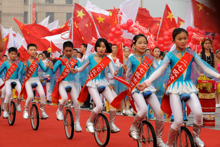 Children perform on unicycles during the Beijing Olympic torch relay in Zhengzhou, Henan Province, July 25, 2008. [Xinhua]