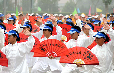 Residents perform Tai Chi with fans in hands at the opening ceremony of the Olympic torch relay in Sijiazhuang, Hebei province, July 29, 2008. [Xinhua]