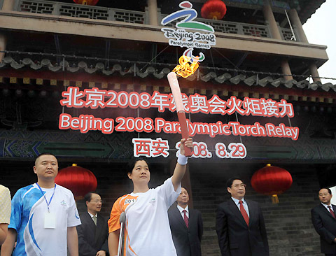 Zhang Hui, the retired disabled athlete displays the torch at the opening ceremony of the Paralympic torch relay in Xi'an on August 29, 2008. [Xinhua]