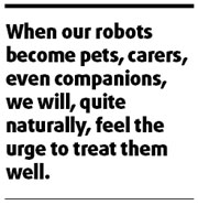 His book reminds us that humanity is an act: it is something we do. When our robots become pets, carers, even companions, we will, quite naturally, feel the urge to treat them well. When it comes to being human, we will give them the benefit of the doubt, the way we give the benefit of the doubt to our pets, our children, and each other.