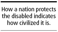 How a nation protects its disabled people should indicate how civilized it is. The adoption of the amendment to the Law on Protection of Disabled Persons by the National People's Congress Standing Committee yesterday is a sign that China is making progress in guaranteeing equal rights in all areas for its 83 million disabled people, who comprise 6.34 percent of its population.