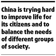 China is trying hard to improve life for its citizens and to balance the needs of different groups of society. Just to cope with the logistical challenges of providing food and shelter for 1.3 billion people while dealing with the transition from a planned economy to a market economy is not an easy job for any government.