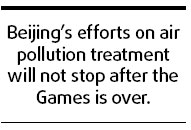 Updated: 2008-08-22 07:45 Is Beijing's air quality still a concern? Some people seem to have underestimated the host city's capability to keep its promise of clearing up its air for the Olympic Games. Monitoring results show that the city's air quality has reached the required standards in every single day over the past three weeks although it looked misty on some days because of too much moisture in the air and low air pressure. The blue sky and white clouds for most of the Games' days were irrefutable evidence that the rhetoric about the host city's ability to honor its promise of clearing up its air for the Games was largely motivated. And some athletes were even advised to wear air masks, which have been proved to be a piece of useless advice.