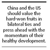 Updated: 2008-12-31 07:49 Bilateral ties between China and the United States have developed over the past 30 years along a generally tortuous but "forward moving" road. Since diplomatic relations were established on Jan 1,1979, the two countries maintained a smooth relationship until May 1989. Both sides reached a new agreement on the long-controversial US arms sales to Taiwan during this period, clearing away one of the largest obstacles to development of the bilateral ties. It is by no means fortuitous that diplomatic normalization between the two countries coincided with China's adoption of the reform and opening-up initiative. A normalized relationship with the White House formed an important component in China's development strategy mapped out by late leader Deng Xiaoping, the chief architect of China's reform and opening-up program. The move turned out to be a big step in helping open a new page in Sino-US relations. In the summer of 1989, bilateral ties plunged into a low point owing to the US intervention in China's move to crack down on a political turbulence. Afterwards, the two countries had to look upon each other's status in their own international strategic maps and tried to overcome the hurdles. Relations have gradually come back on the track of a smooth development. In mid-November 1999, representatives from the two countries reached an accord on China's entry into the World Trade Organization. A bill on ratifying the Permanent Normal Trade relations (PNTR) with Beijing was passed by the US Senate and House of Representative respectively in May and September the following year. The milestone event has greatly boosted the development of bilateral relations. Since the beginning of the new century, a constructive relationship of cooperation has been fostered in an all-round manner, with leaders of the two countries frequently meeting each other on a variety of occasions. The top-level meeting mechanism, along with many other regular dialogue and cooperation channels, has unceasingly injected a new vitality into bilateral ties. Economic interdependence between the two countries has been deepening and none of them can now do without the other. Ever-expanding exchanges and links among their society and people have further consolidated the foundation for a strengthened relationship. As the world's largest developing and developed countries, China and the US should value the hard-won fruits in bilateral ties and do their utmost to press ahead with the momentum of their healthy development. The two nations should first have enough respect for each other's concerns, especially concerns over their core interests. The Taiwan question has long involved China's pivotal national interests and the US should deal with it in a cautious manner. The one-China principle contained in the three joint communiqus has constituted a solid political foundation for the development of bilateral ties and it cannot be weakened at any time. The joint efforts made by Beijing and Washington in maintaining stability across the Taiwan Straits have created a good model for boosting bilateral ties. However, we should not understate their policy and strategic difference in the long term. The continued US-Taiwan military cooperation and arms sales to the island will forever hang like Damocles' Sword over a final settlement of the vexed Taiwan question. A rare opportunity now emerges across the Straits for a better mainland-island relationship, which will also contribute to a stable Sino-US relationship. At the same time, the US should also handle the Tibet issue in a cautious manner, as it is also one that relates to China's core national interest.