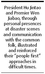 Updated: 2008-12-31 07:49 Eventful. That is perhaps the only word appropriate for 2008. So much so that each of us can name a few qualified entries for the top-10 domestic news roster without a second thought. We saw long-cherished dreams come true: The Beijing Olympics, the first spacewalk by a Chinese, the opening of direct postal and transport services across the Taiwan Straits. We saw humanity's hopeless vulnerability: The paralyzing snow storms, the devastating Wenchuan earthquake. We witnessed the brutality of human sins: The Lhasa riot, the Sanlu milk powder and an industry-wide scandal. And how can the new national leadership lineup, the largest ever stimulus package, and the 30th anniversary of reform escape the discerning eyes of China watchers? What we have been through in 2008 may not make this a particularly pleasant New Year's Eve. Wenchuan is not a bygone episode yet. The new catchword is recession. But today there is no ground for pessimism. We could not afford to imagine how much worse things can get had all the adversities occurred decades back. Even at the saddest moments, either as blizzards cut off power supplies in the icy south, or collapsed cliffs made victim communities inaccessible in northern Sichuan, we did not lose hope, did we? That was confidence. In our country's unprecedented means and capacities, financial and technical. And in the way the government responds. Thirty years of reform and opening up rewarded the nation with an enviable accumulation of wealth. Which not only boosted our capabilities of self-relief in troubled times. Never before has the world counted so much on us for a helping hand, though we are far from being rich. The rescue efforts during the southern snowstorms and the Wenchuan tremor would otherwise be inconceivable. The 1976 Tangshan earthquake was a telling reference.