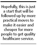 Updated: 2009-01-12 07:31 If it works, it should make everyone feel a little better about healthcare - and make healthcare a little more accessible to more people. Patients will no longer have to shell out the 7 to 15 percent extra fees that State-owned hospitals charge on medicines. The Health Ministry's announcement last week is a welcome first step in China's long-delayed healthcare reform. The new policy, to be adopted on trial basis, is intended to stop hospitals from relying too much on income from medicines. It is estimated that income from the sale of medicines makes up 50 percent of a hospital's revenue on an average. But the catch is that a doctor's income too is closely tied to the hospital's earnings from medicine sales. No wonder it is common for doctors to prescribe expensive drugs while cheaper drugs can work just as well or possibly even better. Part of the deficit caused by reduced income from drug sales will be made up by increased charges on patients for the service that doctors provide. But such expenses will be covered by basic medical insurance. That means those who have such insurance will have cheaper medical bills for seeing their doctors.