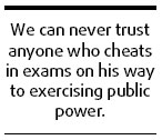 Updated: 2009-01-19 07:35 All cheatings are bad, but ones that pollute public life are the most reprehensible. Those who cheat in examinations for civil servants fall into the category of worst offenders and deserve the severest punishment. State Bureau of Civil Servants revealed last week that nearly 1,000 candidates were caught cheating in the examinations last year, the largest number ever. Of them, more than 500 got the answers through some technological aid from illegal organizations. These organizations supposedly provide examinees with standard answers to examination papers for a fee. As everyone knows, what cheating in exams challenges is the principle of fairness and equality. There are strict rules to punish students who cheat in school tests and those who cheat in national college entrance exams. But there are no specific rules with regard to cheating in exams for civil servants. Shanghai's rules stipulate that anyone who is found cheating in such exams will not be allowed to take them for five years.
