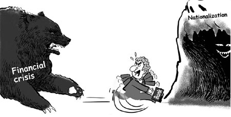 Updated: 2009-02-12 07:44 The most recent phase of the financial crisis, since the collapse of Lehman Brothers in September 2008, has been characterized by large bank losses and the continued threat of bank collapses. The size of the calamity raises the question of whether small countries can really afford bank bailouts. But the definition of "small" keeps changing: a few months ago, small meant Iceland, and now it means the United Kingdom. The aftermath of the banking crisis requires thinking about not only the most appropriate form of banking legislation, but also the appropriate size of the state. There has always been uncertainty about the best design of a banking system, and there has always been competition between different sorts of banking regulation. On the one hand, there is the idea - which defined banking for much of American history - that banks should be close to the risks that they must judge. This ideal grew out of Andrew Jackson's titanic struggle with Nicholas Biddle and the Second Bank of the United States. Populism was pitted against the financiers, and populism won. As a result, most nineteenth-century US banks did not have branches, and were limited to one state. The alternative approach was that of Canada, which, because of its roots in secure British rule, had much less fear of political centralization, and was prepared to tolerate a nation-wide banking system. Canada's large banking system distributed risk more widely, and fared better in episodes of financial panic, whether in 1907 or in 1929-1933.