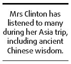 Updated: 2009-02-23 07:33 If the point of Hillary Rodham Clinton's maiden voyage overseas in her new role as United States secretary of state was to assure and reassure, she made it. If her four-country Asia trip was to present a fresh American approach to world affairs, she did so. In Beijing at least, Clinton's visit delivered what is needed desperately - a sense of certainty in the diplomatic vacuum between two presidencies. Until very recently, many had waited anxiously for the new administration's China overtures, wondering if the precious signs of stabilization in bilateral ties at the end of the Bush years could survive the new White House resident's ambitions for change. With Clinton in town highlighting common concerns, they finally received the much sought after relief. Her reference to the ancient Chinese aphorism "tongzhou gongji," "when in one boat, help each other," received enthusiastic resonance from Premier Wen Jiabao and the average Chinese alike.