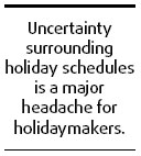 Updated: 2009-03-27 07:40 With only about one month before the May Day holidays, the lack of agreement between the central government and some of the local governments on how long the holidays will be is frustrating. Though overcrowded "golden weeks" are not necessarily the right way to spur domestic consumption, uncertainty surrounding holiday schedules is a major headache for anyone trying to make plans. It was only on Wednesday that Guangdong's provincial government announced its own plan to revive the May Day golden week holiday. According to the pilot program, local residents will enjoy a weeklong vacation, including two days of paid leave, instead of a national holiday from May 1 to 3. The belated announcement leaves those with itchy feet little time to plan their schedules.