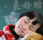 Children practice sleeping during a special "sleep class" ahead of World Sleep Day at a primary school in Nanyang city.