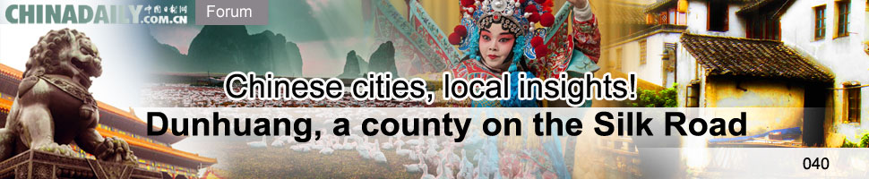Dunhuang(敦煌) is a county-level city in northwestern Gansu province, Western China. Located at the crossroads on the Silk Road, the city is known world-wide for its grottoes, historical murals and Buddhist scriptures. Today, tourists can visit historically significant and senic locations such as the Crescent Moon Spring and Singing Sand Mountains.
