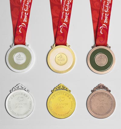The design of the medals for Paralympic Games is inspired by the ancient Chinese dragon-pattern jade disc: jade disc wedged on the obverse of the medal with the Emblem of the Beijing 2008 Paralympic Games in the center. The color of jade varies with the gold medal, silver medal and copper medal from white, gray-white to gray. The design of the medal hook derives from jade "huang", a ceremonial jade piece with decoration of double dragon pattern and "Pu", the reed mat pattern, classic and elegant.