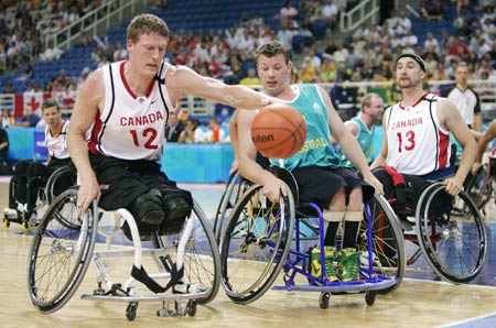 As in able-bodied Basketball, players must dribble the ball when having gained control of the ball on the court. It is a traveling violation to take more then two pushes on the wheels without dribbling the ball. A player is not allowed to touch the playing surface with his or her feet while in possession of the ball.