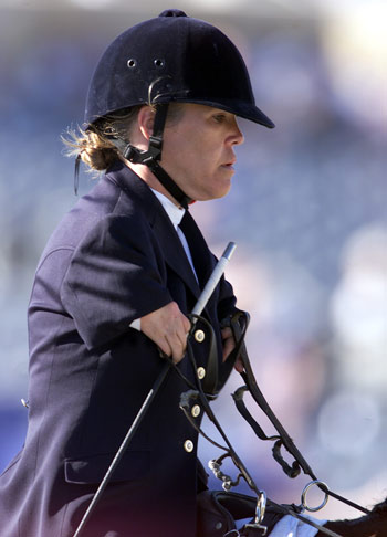 Visually impaired Grade III and Grade IV riders may use alternative methods to orientate themselves within the arena. They are allowed "callers" around the arena who call out a letter to the rider as they approach and pass. Many experienced riders use only one caller. The Grade III double silver medallist in Sydney, Anne Cecilie Orr from Norway, is totally blind and rode to a whistle in her music test. In 2003, she developed a sound system that can be quickly erected round the arena for a blind person's test.'
