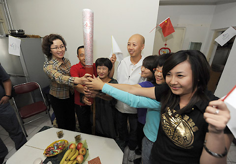Na Risha (third L), a local amateur singer with a disability, holds the Paralympic torch with her family at home in Hohhot, Inner Mongolia Autonomous Region, August 30, 2008. [Xinhua]