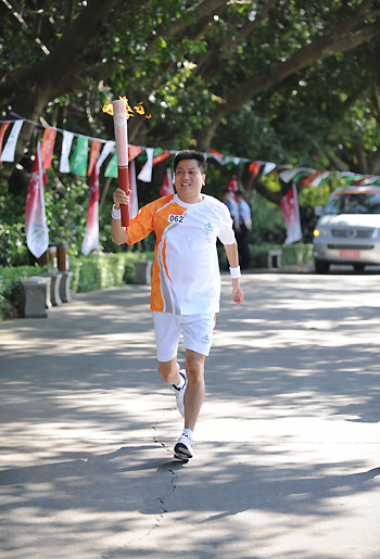Torchbearer Chen Zhonghao runs with the Paralympic torch during its relay in Shenzhen, Guangdong Province on August 30, 2008. [Xinhua]