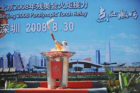 Final torchbearer Shen Jianping lights the cauldron during the Paralympic torch relay in Shenzhen, Guangdong Province on August 30, 2008. [Xinhua]