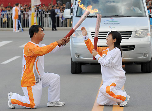 Two torchbearers pass the Paralympic flame during the torch's relay in Hohhot, Inner Mongolia Autonomous Region, August 30, 2008. [Xinhua]