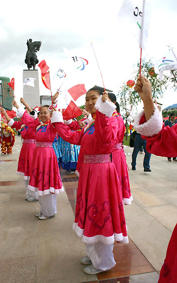 Local residents dressed in Mongolian ethnic costumes welcome the Paralympic torch as it passes through Hohhot, Inner Mongolia Autonomous Region, August 30, 2008. [Xinhua]