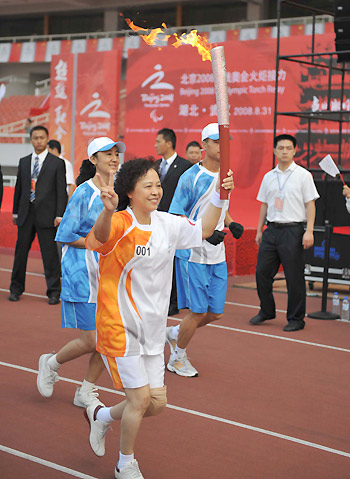 Cheng Yu, the former table tennis gold medalist of 1988 Paralympics, gestures during her leg of the Paralympic torch relay in Wuhan, Hubei province. [Xinhua]