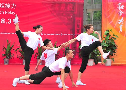 Local dancers stage a performance at the opening ceremony of the Beijing Paralympic torch relay in Changsha, Hunan province on August 31, 2008. [Xinhua]
