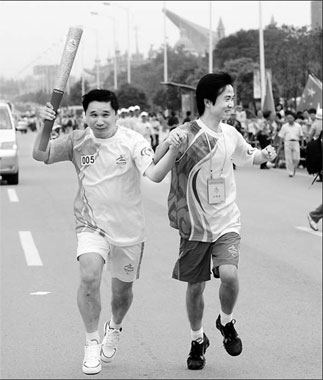 Zhu Gang (left), who is visually impaired, runs as a torchbearer with the help of a volunteer in Changsha yesterday. Xinhua