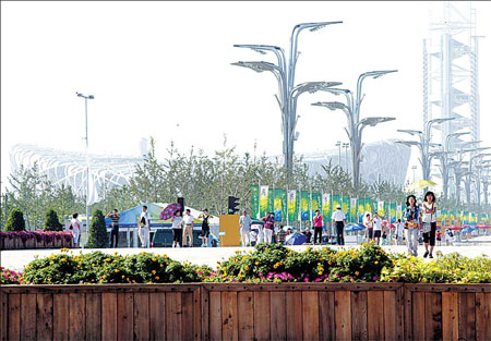 People enjoy the atmosphere of the Olympic Green, where the Bird's Nest is located, during the just-concluded Games. Xu Jingxing