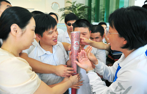Lv Xiaohong(R), a doctor at Nanjing Disabled Recovery Center, introduces the torch to her visually-impaired colleagues on Tuesday.[Xinhua]