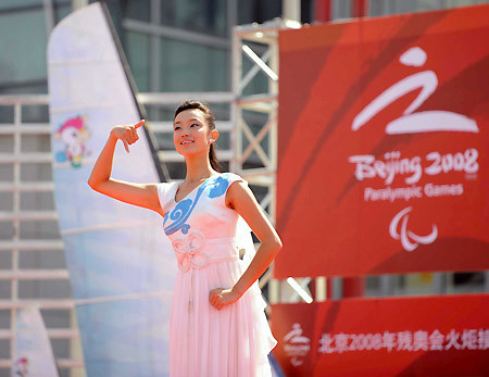 Hearing-and speech-impaired stage presenter Jiang Xintian, uses sign language to read a poem on September 2, 2008, marking the start of the Paralympic torch relay in Qingdao, Shandong province. [Xinhua]