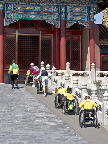 Paralympic athletes tour the Forbidden City using a ramp, which has made the attraction more accessible, September 1, 2008. [Xinhua]