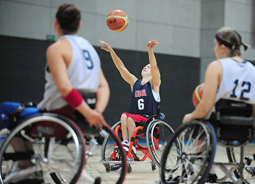 Emily Hoskins (C) of the US takes a shot during a wheelchair basketball training session on September 2, 2008 in Beijing at the National Indoor Hall, ahead of the 2008 Paralympic Games which takes place from September 6th to 17th in Beijing. The defending champion gold medalists from the 2004 Athens Paralympics begin the defense of their title on September 8. [Agencies]