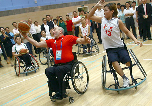 International Paralympic Committee president Philip Craven (L) takes part in a friendly basketball match with Chinese Paralympic athletes at the Olympic community in Beijing on August 30, 2008. [Agencies]