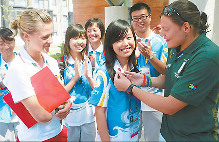 Natalie du Toit (right) and Natalia Partyka talk with volunteers at the Paralympic Village Tuesday. [China Daily]