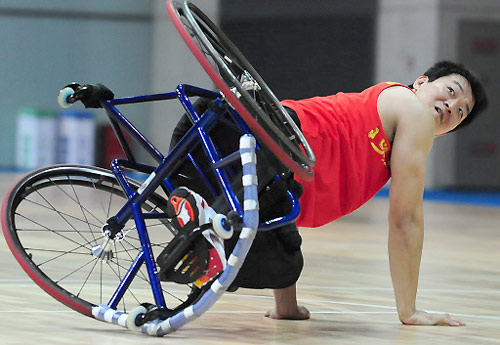 Chinese wheelchair basketball player eyes his shot after falling during a training session on September 2, 2008 at the National Indoor Stadium in Beijing, as preparations are underway for 2008 Paralympic Games which takes place from September 6th to 17th in Beijing. [Agencies]