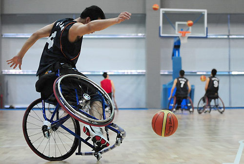 A player about to tip over from his wheelchair as Chinese wheelchair basketball players attend a training session on September 2, 2008 at the National Indoor Stadium in Beijing, as preparations are underway for 2008 Paralympic Games which takes place from September 6th to 17th in Beijing. [Agencies]