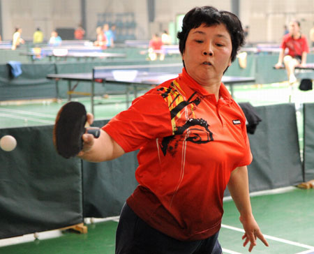 Zhang Xiaoling, five-time Paralympic table tennis champion, trains in Xi'an of Northwest China's Shaaxi Province in this file photo taken on March 25, 2008. Zhang has competed in five consecutive Paralympics and won ten gold medals in total. She will compete in her sixth Paralympics in Beijing. [Xinhua]