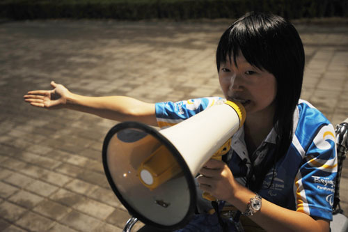 A Paralympic volunteer in a wheelchair uses a bullhorn to guide spectators attending the reheasal for the opening ceremonies of the 2008 Paralympic Games, September 4, 2008. [Xinhua]