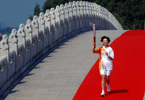 Torchbearer Zhou Ye takes part in the Beijing 2008 Paralymipc torch relay in the Summer Palace in Beijing September 5, 2008. [Xinhua]