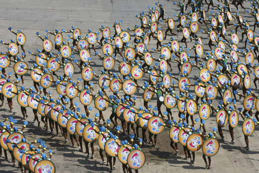 Students from the Tagou martial arts school hold logos of Fu Niu Lele, the official mascot of the Beijing 2008 Paralympic Games, as they practise at a training base on the outskirts of Beijing September 5, 2008. More than 2,000 students of the school from Henan province will perform during the opening ceremony of the Games on Saturday. [Agencies]