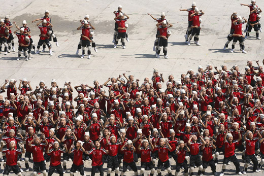 Students from the Tagou martial arts school practise at a training base on the outskirts of Beijing, September 5, 2008. More than 2,000 students from the school in Henan province will perform during the opening ceremony of the Beijing 2008 Paralympic Games on Saturday. [Agencies]