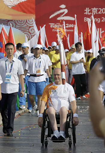Torchbearer Philip Craven, President of the International Paralympic Committee, takes part in the Beijing 2008 Paralympic torch relay in Beijing September 5, 2008. [Agencies]