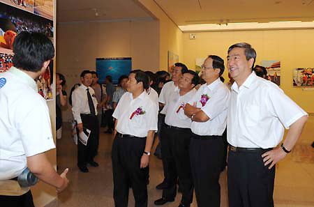 Li Congjun (R), president of Xinhua News Agency, visits the Panoramic Photo Exhibition of the Beijing Olympic Games opened in Beijing Sept. 5, 2008. More than 300 photos taken by Xinhua's photojournalists were shown in the exhibition which was held on a theme of sharing glory and dream.[Xinhua]