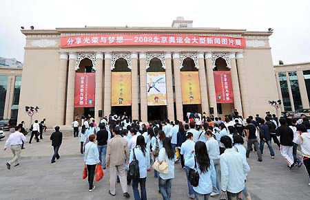 Visitors go for a photo exhibition in Kunming, southwest China's Yunnan Province, Sept. 5, 2008. The five-day photo exhibition on the Beijing Olympic Games named Sharing Glory and Dream opened here Friday, displaying over 200 photos taken by photographers with Xinhua News Agency.[Xinhua]