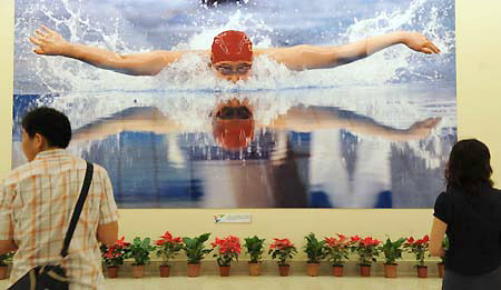 Spectators look at a photo during a photo exhibition in Beijing, capital of China, Sept. 5, 2008. A photo exhibition on the Beijing Olympic Games named Sharing Glory and Dream opened on Friday, displaying over 300 photos taken by photographers with Xinhua News Agency. [Xinhua]