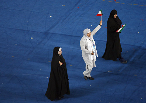 An athlete (in white) waves the Iranian National flag as the Iranian Paralympic delegation parade into the National Stadium, September 6, 2008. [Xinhua]