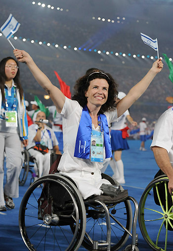 An athlete waves the Israeli national flag inside the National Stadium, also dubbed "Bird's Nest", in Beijing, September 6, 2008. The opening ceremony of the Beijing Paralympic Games began at 8 p.m. on Saturday night. [Xinhua]