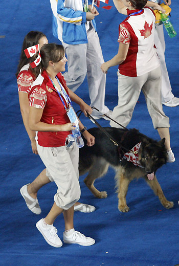 A guide dog leads a visually impaired athlete (2nd L) as the Canadian Paralympic delegation parade into the National Stadium in Beijing, September 6, 2008. [Xinhua]