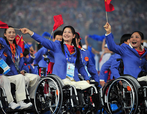 Members of the Chinese Paralympic delegation parade into the National Stadium, also dubbed "Bird's Nest", in Beijing, September 6, 2008. [Xinhua]